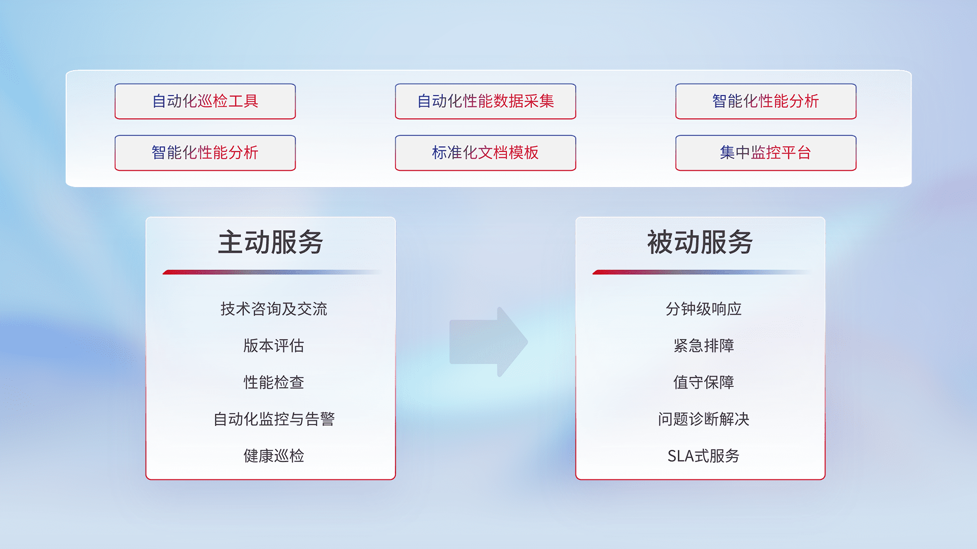 智能化工具和标准化文档,,,保障服务质量,,,提供主动服务(包含技术咨询、、、版本评估、、性能检查、、自动化监控与告警、、、健康巡检)和被动服务包含(分钟级响应、、紧急排障、、、值守保障、、问题诊断解决、、SLA服务)。。。