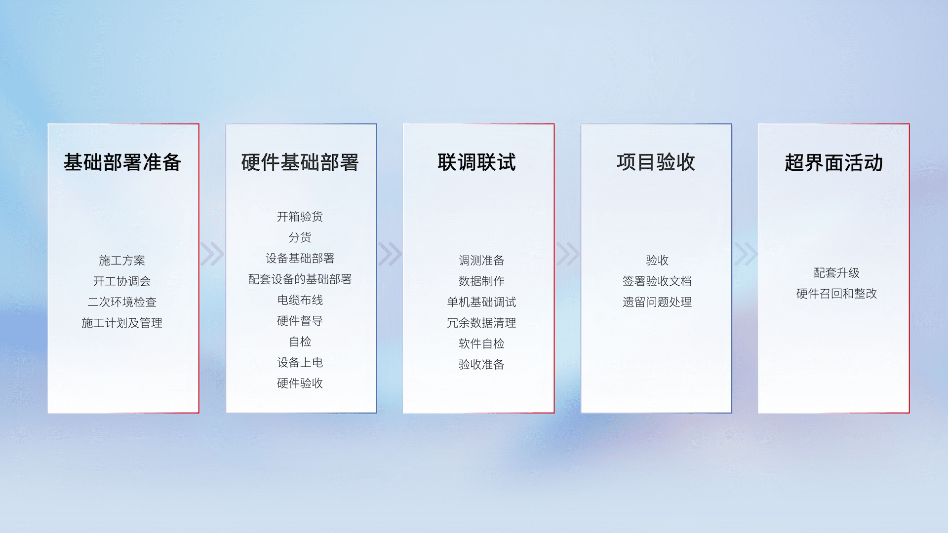 从基础部署准备、、、硬件基础部署、、联调联试、、、项目验收、、、越界面活动的全过程可追溯,,保证施工质量和进度。。。。